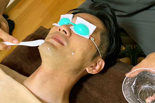 ジェルを塗布し施術の準備をします。ほくろやシミなど施術不可の箇所をシールで隠します。